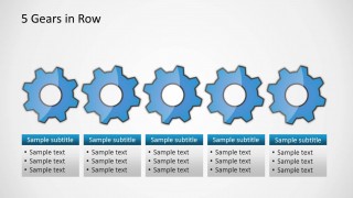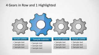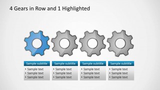 The presentation template contains multiple slide designs prepared to accomplish different diagram needs, for example the 4 gears in row slide let you describe a process of four steps using gear illustrations. There are textboxes that you can edit with the process title and description for each step.