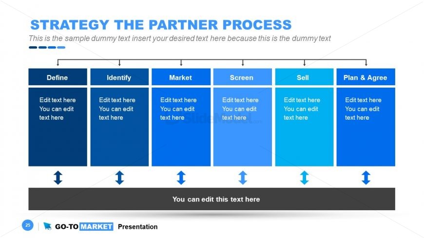 Six component channel partner diagram design for PowerPoint presentations with text placeholders and categories: Define, Identify, Market, Screen, Sell, Plan and Agree. This slide can be used to prepare a channel partner strategy and present it to an audience.